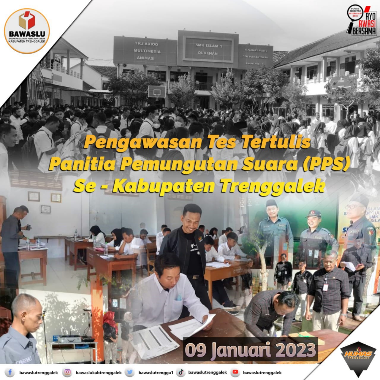 Ahmad Rokhani menyampaikan "Bawaslu Kabupaten Trenggalek melakukan pengawasan tes tulis calon PPS se-Kab Trenggalek. Pelaksanaan tes tulis dilaksanakan tanggal 9 Januari 2023 di SMK Islam Durenan. Dari Total 1.460 orang yang lolos seleksi administrasi, sebanyak 1.346 hadir mengikuti tes tulis dan sebanyak 114 orang tidak hadir mengikuti tes tertulis". Ungkap Ahmad Rokhani