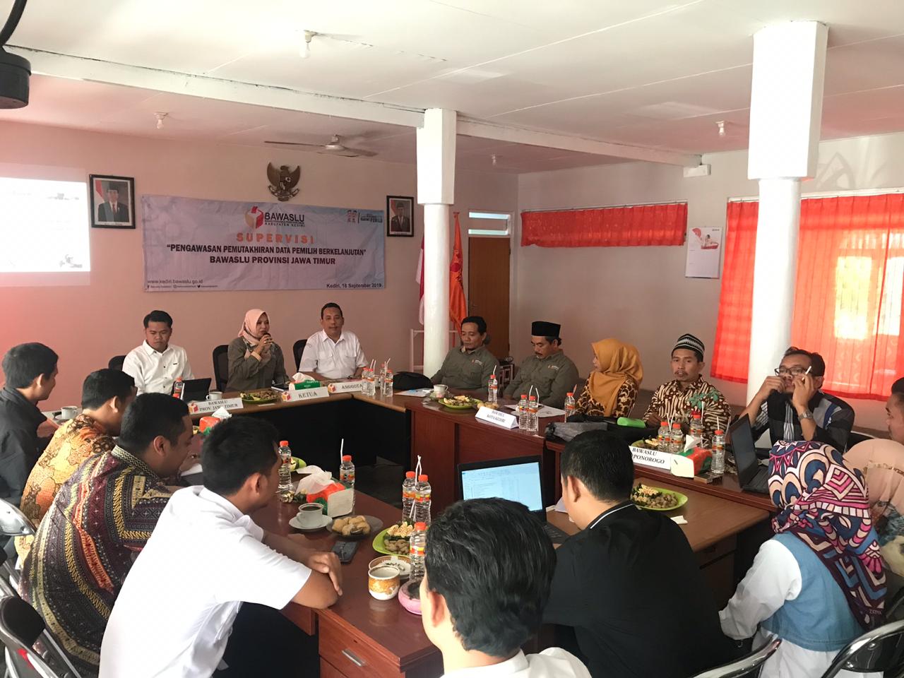 Supervisi dalam rangka pengawasan pemutakhiran data pemilih secara berkelanjutan di Kantor Bawaslu Kabupaten Kediri dihadiri oleh Kordiv PHL Bawaslu Provinsi Jawa Timur Bapak Aang Kunaifi, S.H, Kasubag Pengawasan Bawaslu Jawa Timur Bapak Supratikno, serta staf PHL Bawaslu Provinsi Jawa Timur. Untuk Kordiv PHL Bawaslu Kab./Kota yang hadir yakni dari Bawaslu Kabupaten Kediri, Bawaslu Kota Kediri, Bawaslu Kabupaten Tulungagung, Bawaslu Kabupaten Trenggalek, Bawaslu Kabupaten Ponorogo.
