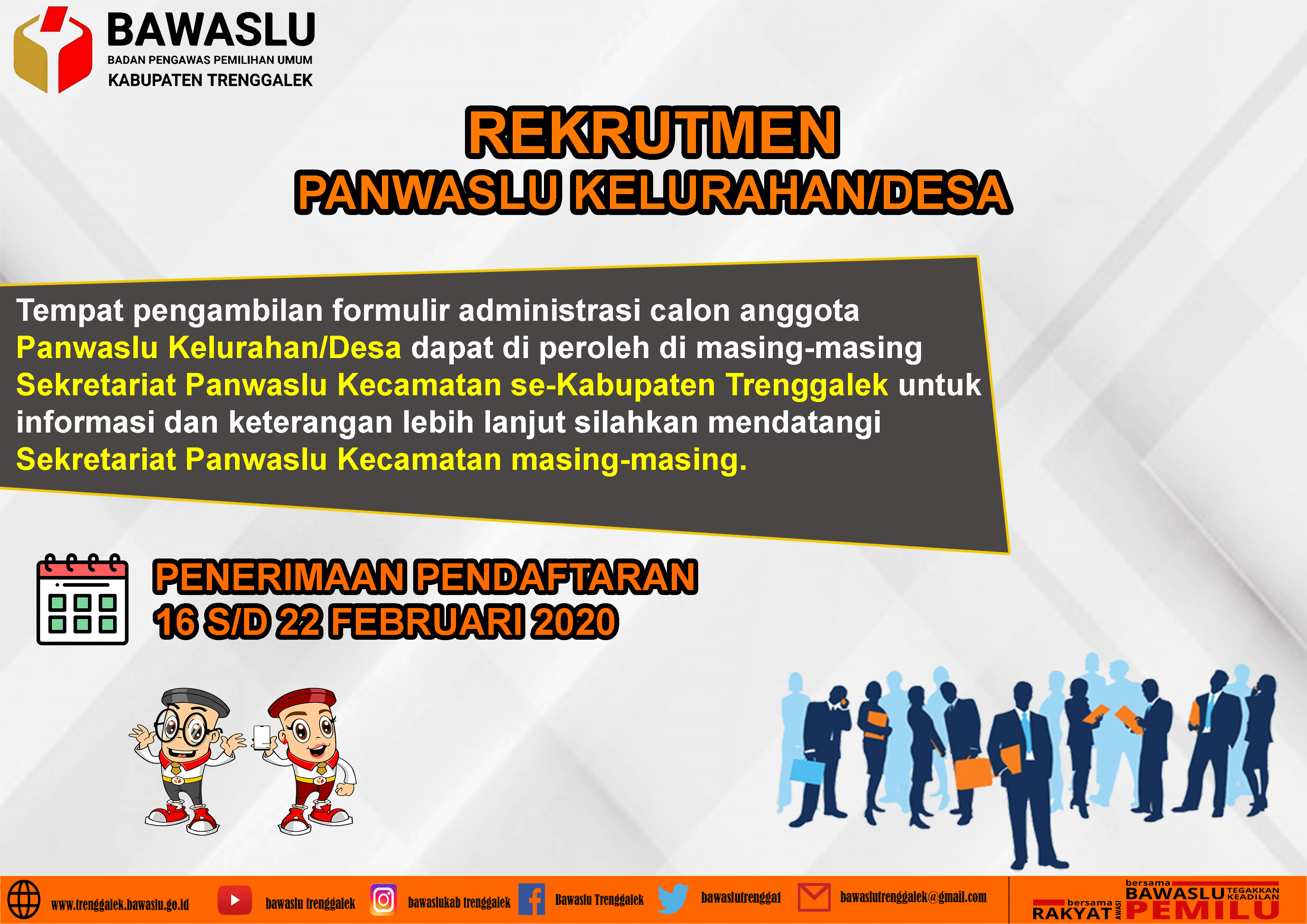 Bawaslu Kabupaten Trenggalek, dalam rangka pembentukan Panwaslu kelurahan/Desa untuk Pemilihan Bupati dan Wakil Bupati Trenggalek tahun 2020, PANWAS KECAMATAN se-Kabupaten Trenggalek berdasarkan Peraturan Badan Pengawas Pemilihan Republik Indonesia Nomor 19 Tahun 2017 sebagaimana diubah terakhir dengan Peraturan Badan Pengawas Pemilihan Umum Republik Indonesia Nomor 8 Tahun 2019, bahwa Bawaslu membuka kesempatan bagi Warga Negara Indonesia yang memenuhi persyaratan untuk mendaftarkan diri sebagai calon anggota Panwaslu Kelurahan/Desa.