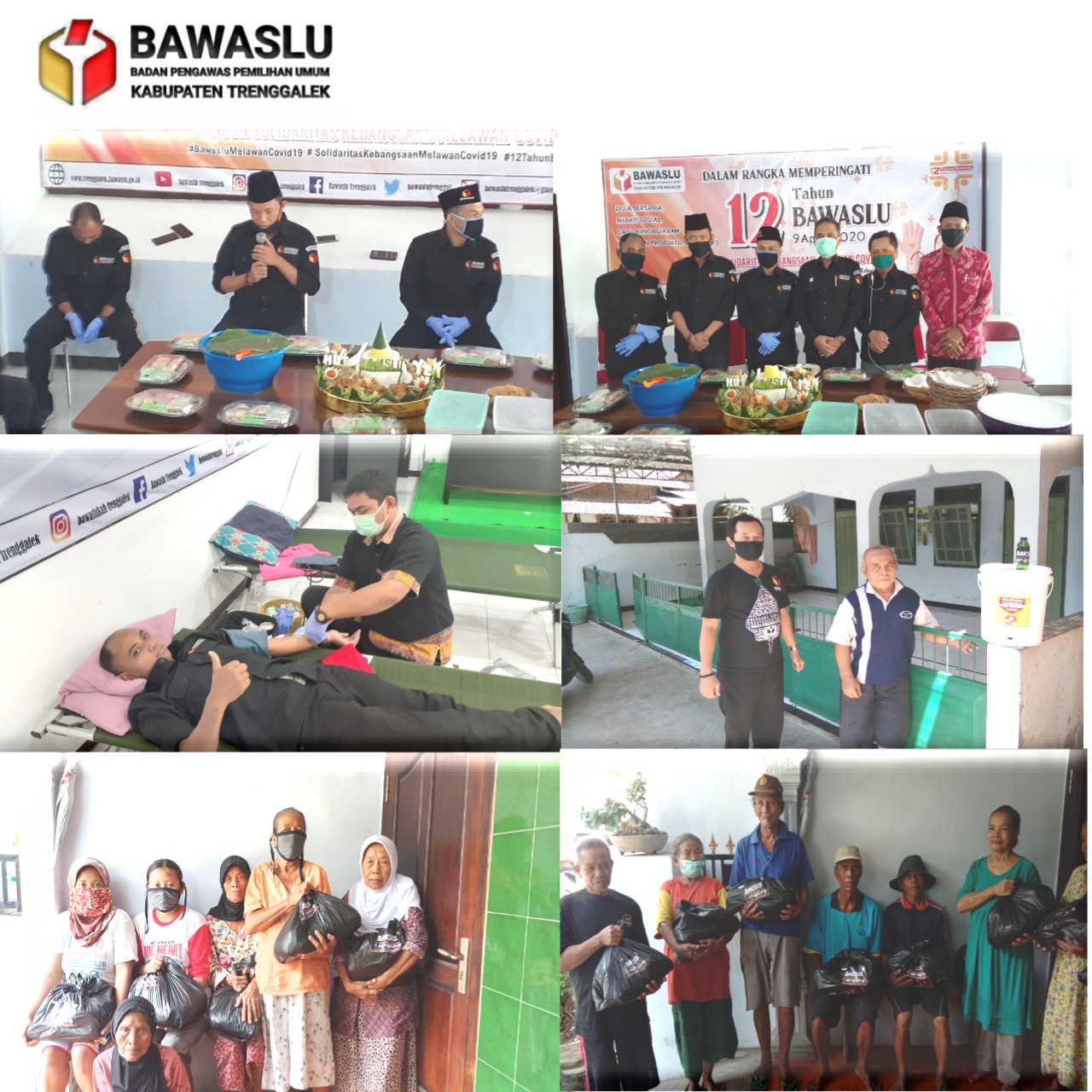 "Bhakti sosial dalam bentuk pembagian sembako (berupa beras, mie instan, telur, minyak) yang berjumlah 40 paket, serta alat kesehatan (berupa timba, hand sanitizer, sabun) sejumlah 40 paket kami laksanakan kemarin (09/04/2020) kepada masyarakat tidak mampu sekitar Kantor Bawaslu Kabupaten Trenggalek, dengan melibatkan pihak Pemdes Rejowinangun, RT, RW, Tak'mir Masjid. Semuanya kami lakukan sebagai bentuk komitmen Bawaslu hadir ditengah-tengah masyarakat dalam rangka bangun solidaritas kebangsaan melawan covid-19 sesuai dengan tema Hari Ulang Tahun (HUT) Bawaslu yang ke-12 kali ini", paparnya