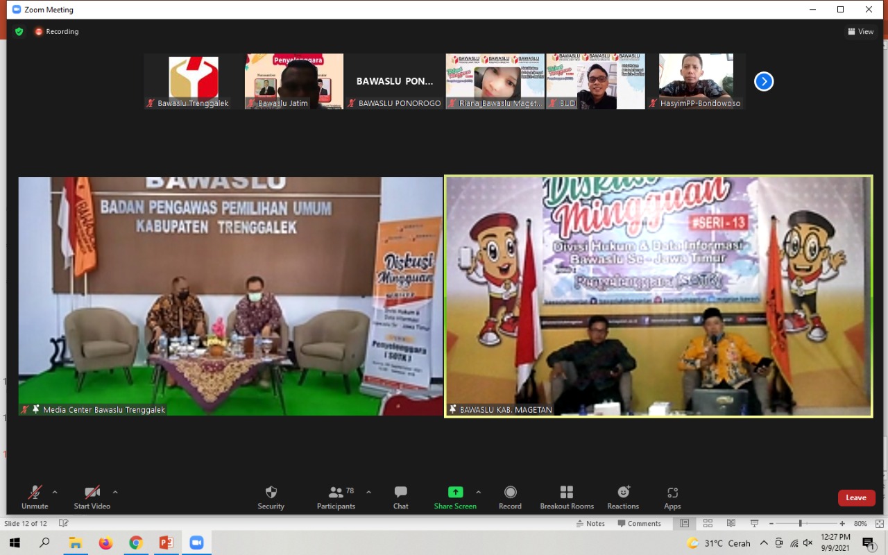trenggalek.bawaslu.go.id- Diakusi mingguan Bawaslu Jawa timur melibatkan Bawaslu kabupaten Trenggalek dan Bawaslu Kabupaten Magetan, dalam Diskusi mingguan Divisi Hukum Data Informasi seri 13 ini mengangkat tema SOTK (9/9/2021).
