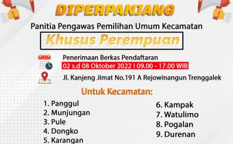 trenggalek.bawaslu.go.id - Badan Pengawas Pemilu Kabupaten Trenggalek Mengumumkan Perpanjangan Pendaftaran mulai tanggal 02 s.d 08 Oktober 2022, waktu Pelayanan pukul 09.00 - 17.00 WIB. Berikut Pengumuman dan Persyaratannya: